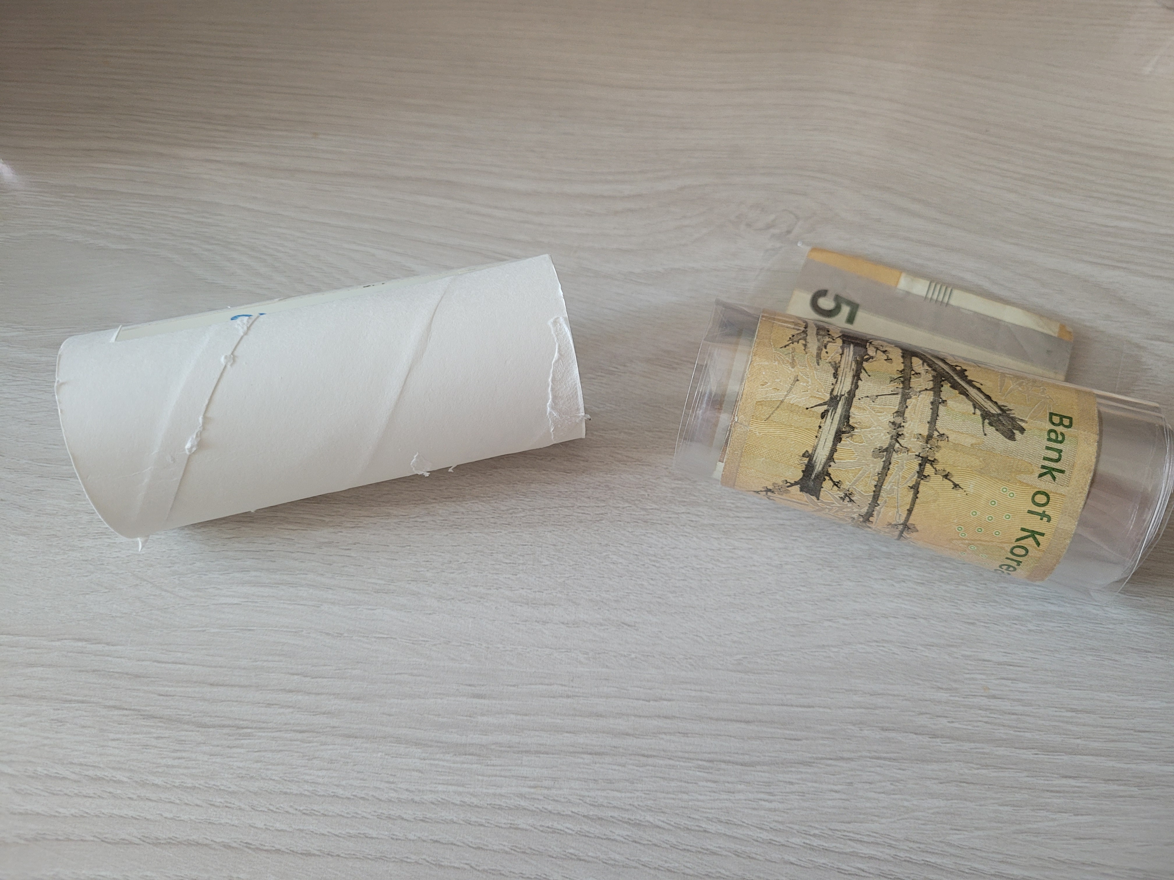 3) 돈을 잘 말아주시고, 다 사용한 두루마리 휴지를 하나 준비해 주세요