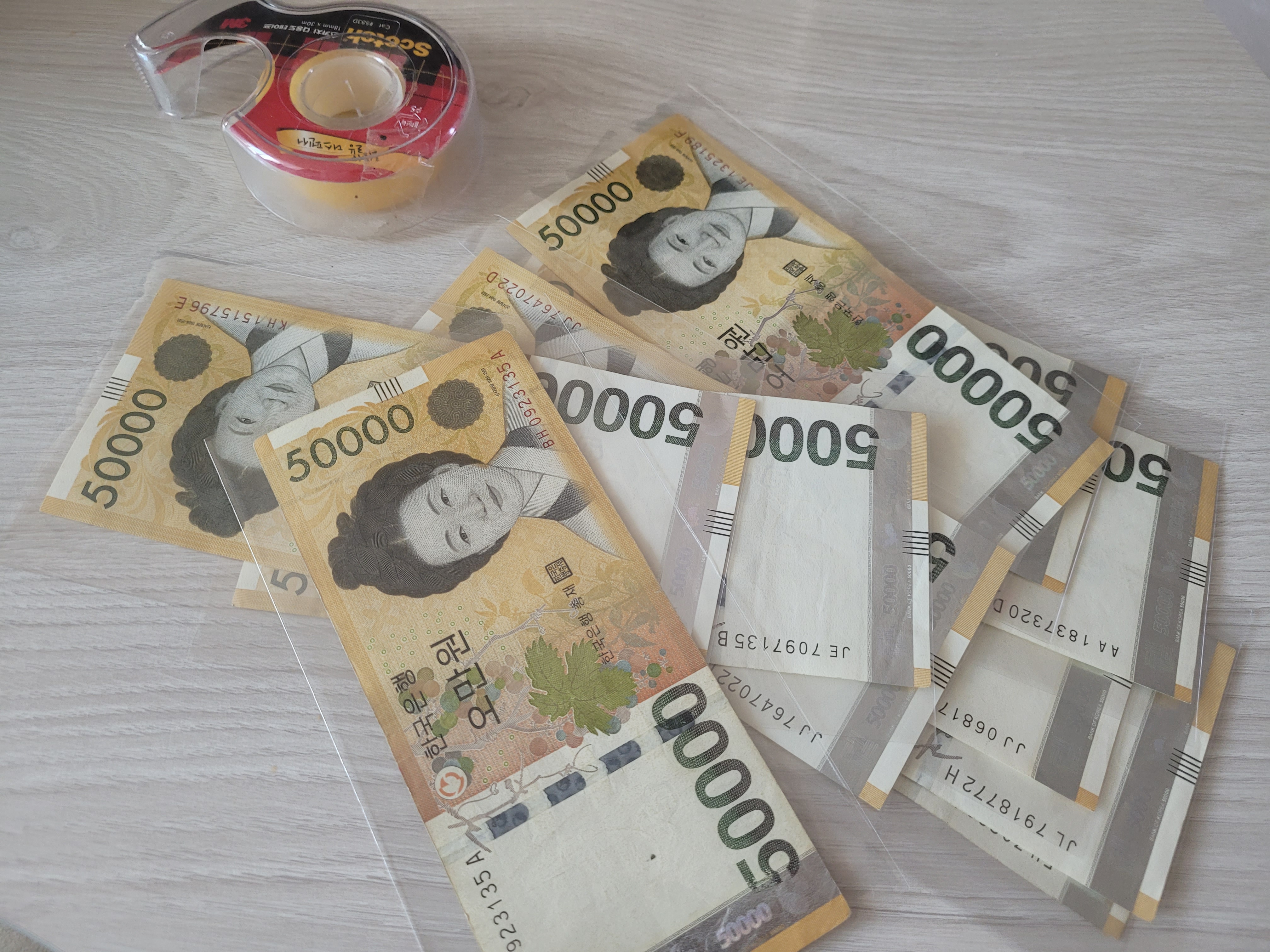 다이소 선물봉투 ( 9* 16 cm ), 스카치 테이프, 그리고 돈!!!